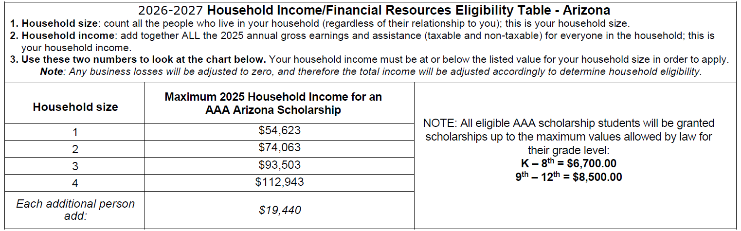 AAA awards 3-year renewable scholarships of up to $25,500 per student for grades 9 – 12 and $20,100 per student for grades K – 8 per student per 3-year term to help pay for tuition at eligible Arizona private schools.