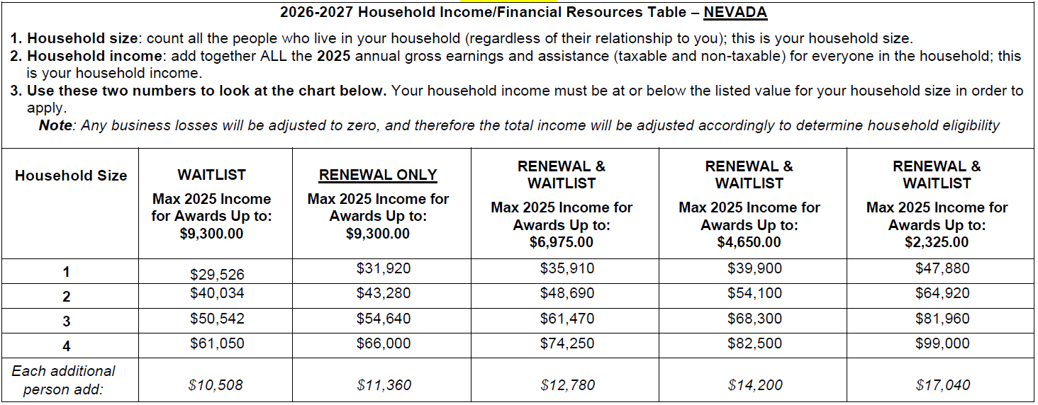 2026-27 NV Household Income / Financial Resources Eligibility Table